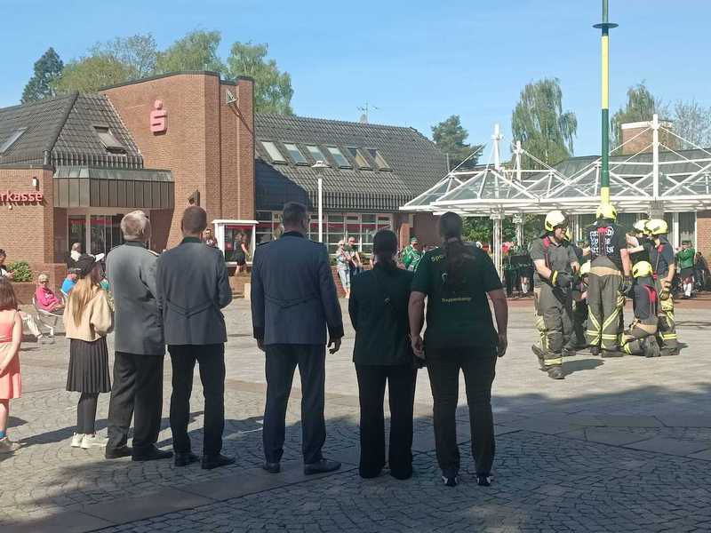 Mit musikalischer Untermalung durch den Spielmannszug Traventhal ging es vom Cafe Friedrich über die Hauptstraße zum Marktplatz, wo der Trappenkamper Bürgermeister ein paar nette Worte an alle gerichtet hat.