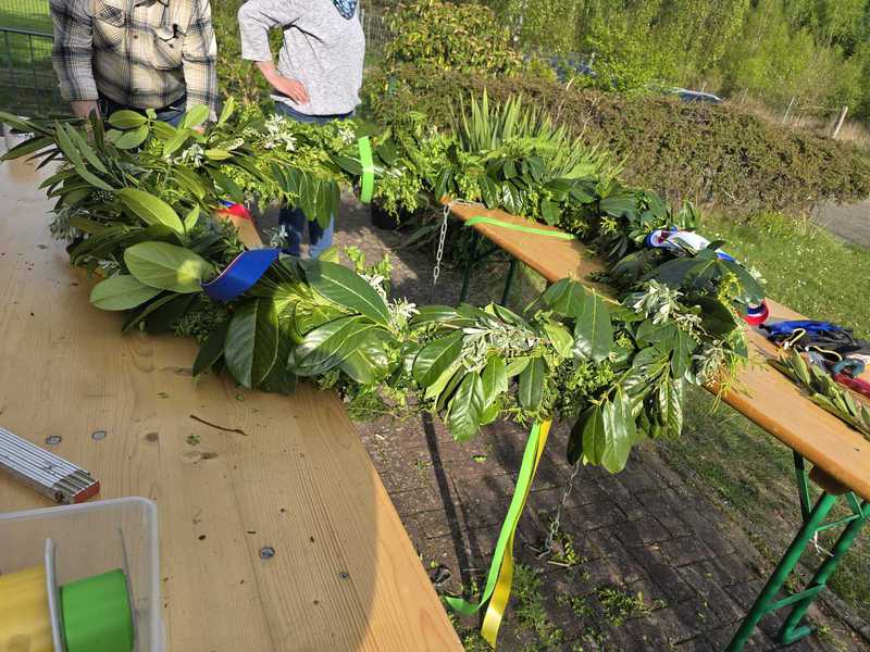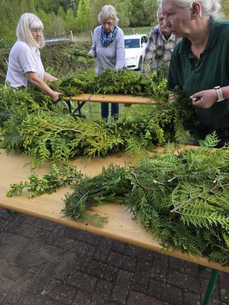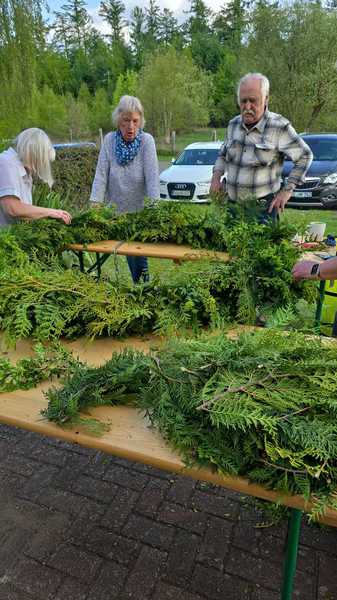 Dafür fanden sich ein paar Helfer ein, die einen hübschen Kranz gebunden haben.