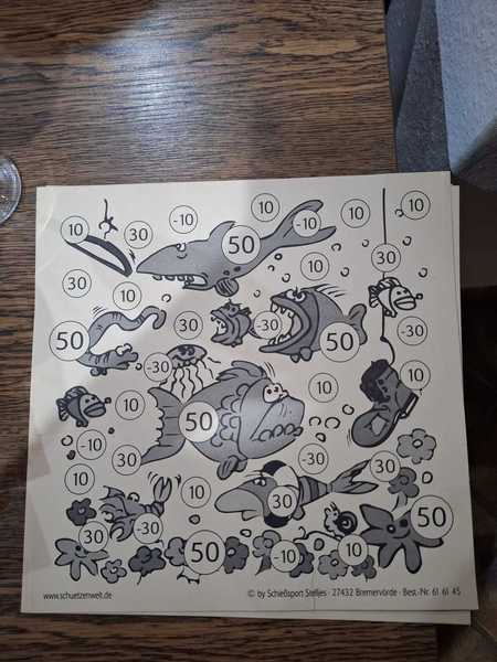 Geschossen wird auf Streifen (10 Wertungsschüsse) und auf eine Spaßscheibe (3 Schüsse). Ergänzt wird das Ganze mit einem Würfel-Wurf.